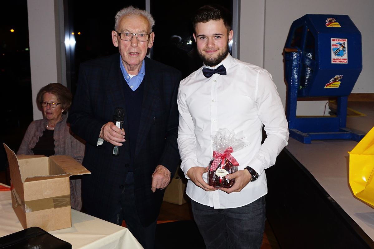 Der Bahnsportler des Jahres 2014 kommt von der Motorsportvereinigung Herxheim: Erik Riss. Der Vereinsvorsitzende Edelbert Müller ehrte ihn bei der MSVH-Party für sensationelle Erfolge. Der 19-jährige Abiturient konnte als Newcomer auf der Sandbahn mit dem Gewinn der Langbahn-Weltmeisterschaft, der Langbahn-Team-Weltmeisterschaft sowie dem Sieg bei den Deutschen Langbahnmeisterschaften alles gewinnen, was in diesem Metier heuer zu holen war. Erik Riss und sein Bruder Mark waren auch die Stützen der Herxheim Drifters beim erneuten Gewinn des Speedway-Team-Cups. „Natürlich steht im nächsten Jahr die Titelverteidigung an oberster Stelle, aber auch im Speedway wollen Mark und ich uns weiter bessern. Dazu müssen wir uns öfters der internationalen Konkurrenz stellen“, gab der jüngste Weltmeister in der seit 1971 währenden Geschichte des Langbahnsports eine kleinen Ausblick auf die nächste Saison. Das Bild zeigt ihn (Mitte) mit Edelbert Müller (rechts) und Joachim Ohmer.